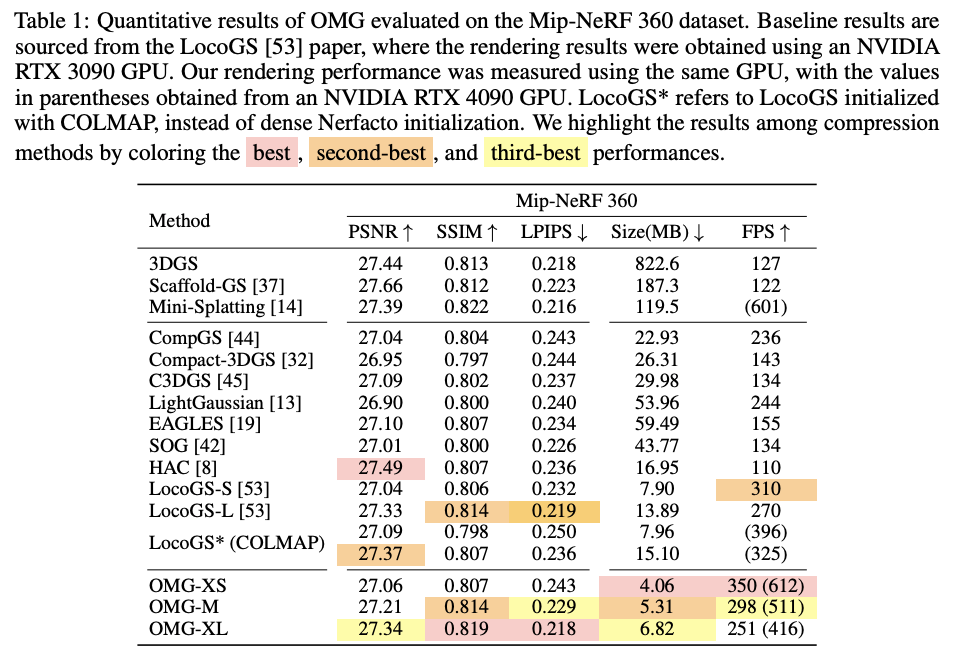 실험 결과를 보면, OMG는 Mip-NeRF 360을 포함한 여러 데이터셋에서 기존 SOTA와 비슷하거나 더 나은 화질을 유지하면서도 모델 크기를 대략 절반 수준까지 줄이고, 수백 FPS 이상의 실시간 렌더링 속도를 달성한다. 또 3DGS-MCMC처럼 다른 변형에도 자연스럽게 붙일 수 있어, 특정 구현에 종속되지 않는 “범용 압축 모듈”에 가깝다는 점도 확인된다.