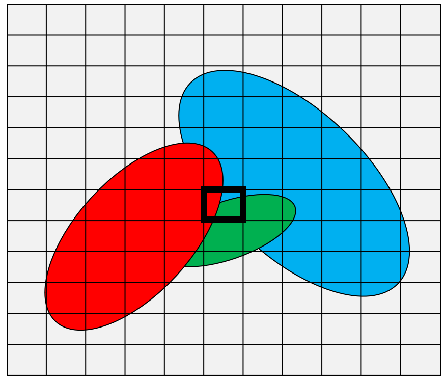 2D 공간상에 투영된 분포들을 이제 균일한 크기로 잘라 최종 Pixel값을 정하고 겹쳐지는 부분들에 대한 분포들이 가지는 불투명도를 라고 하자.