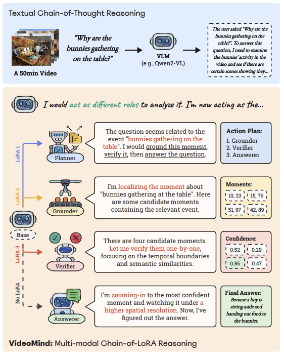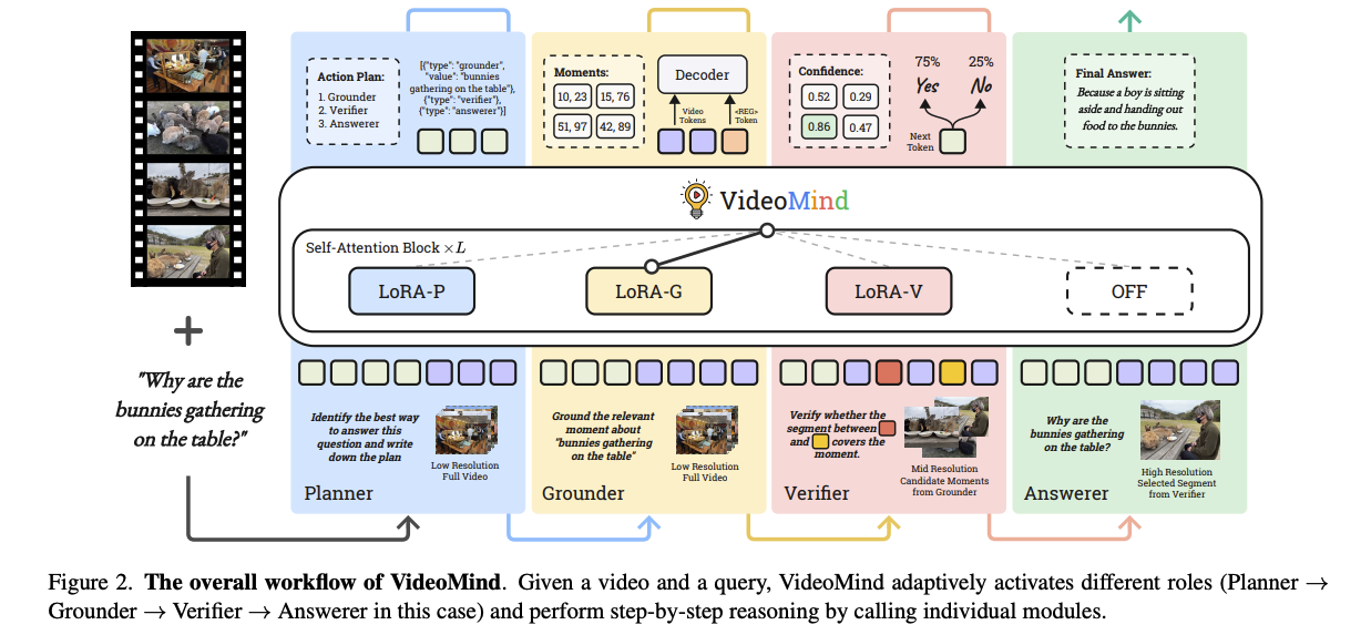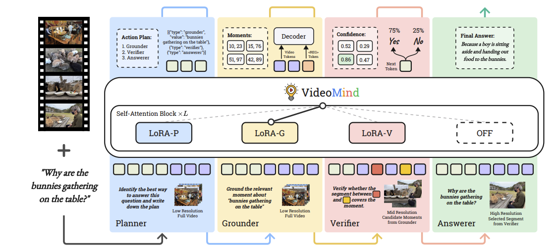 시계열 근거 기반의 비디오 추론을 위해 설계된 새오운 비디오-언어 에이전트인 VideoMind를 소개했다. Planner, Grounder, Verifier, Answerer로 구성된 에이전트 워크플로우를 채택하고 있으며, 이러한 역할들 사이를 효율적으로 전환하기 위해 Chain-of-LoRA 전략을 함께 사용한다.