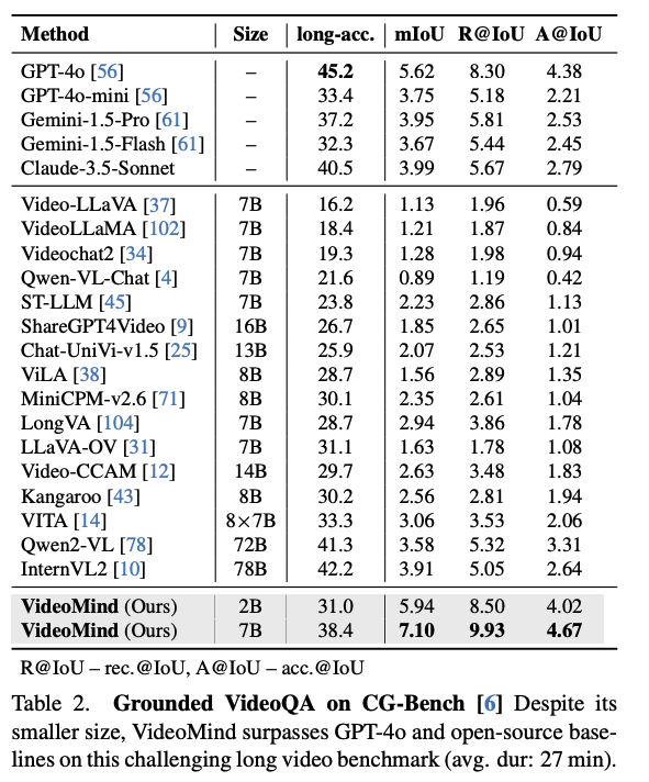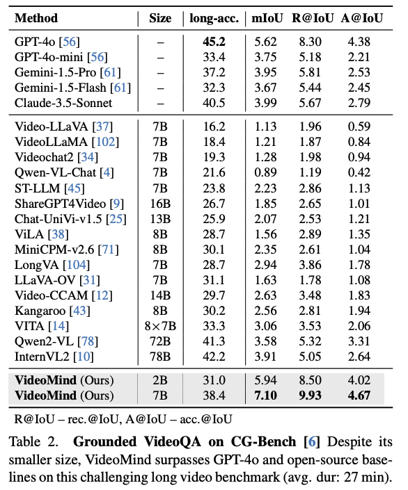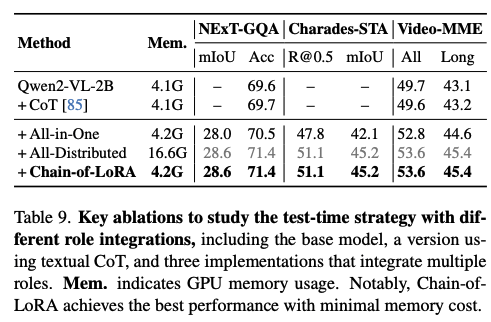 -긴 비디오 장점 : 특히 27분 이상의 긴 비디오를 포함하는 CG-Benc에서, 2B모델은 GPT-4o를 정확도 측면에서 유의미한 차이로 이기며, 이는 Chain-of-LoRA를 통한 단계별 추론 방식이 거대 모델의 단일 패스 추론보다 장편 비디오 이해에 더 효율적임을 증명한다.