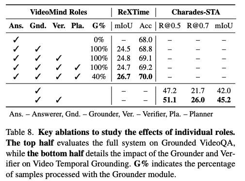 결과: VideoMind는 Answerering-only에서도 기존의 강력한 LMM들과 대등하거나 그 이상의 성능을 보여주었으며, 이는 백본인 Qwen2-VL의 능력을 보존하면서도 에이전트 워크플로우를 성공적으로 통합함을 시사한다.