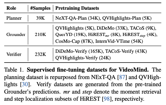 1. Pre-training : 각 역할에 대해 Table1에 나열된 데이터셋을 사용하여 모델을 학습시킨다. 이 단계에서 백본 LLM에 LoRA 어댑터를 도입하고 Grounder를 위한 타임스탬프 디코더를 최적화한다.