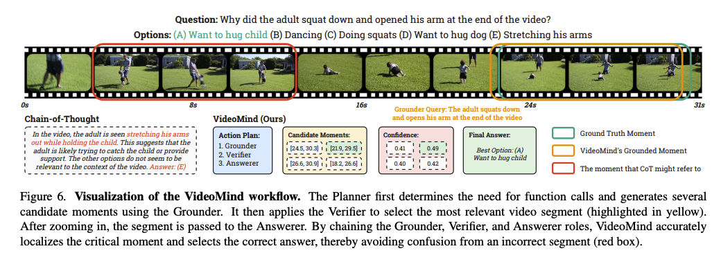 Figure2. VideoMind의 전체 워크플로우. Query가 주어지면, VideoMind는 다양한 역할(이 사례의 경우 Planner → Grounder → Verifier → Answerer)을 적응적으로 활성화하고, 개별 모듈을 호출하여 단계별 추론을 수행한다.
