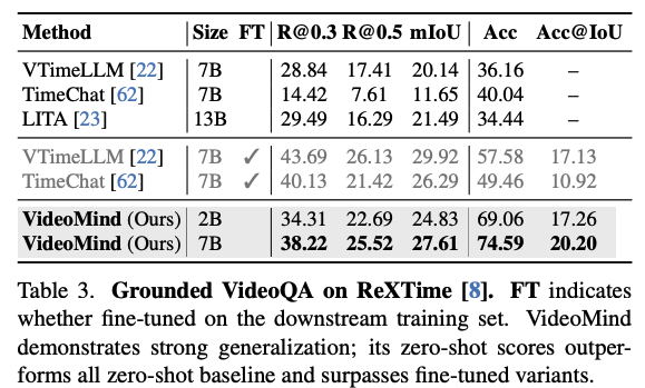 CG-Bench, RexTime,NExT-GQA 세 가지 주요 벤치마크에서 VideoMind의 성능을 평가했다. 이 과정에서 복잡한 추론뿐 아니라 Temporal Grounding을 동시에 요구한다.