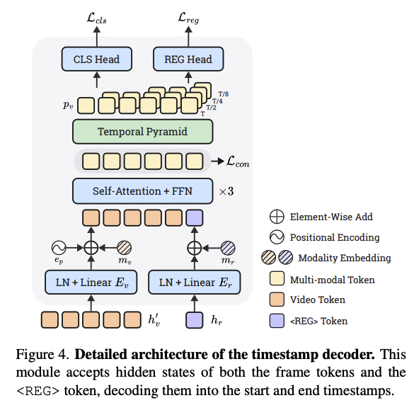 언어 모델링이나 특수 토큰을 통해 텍스트 형태의 타임 스탬프를 직접 예측하는 대신, LLM 위에 구축된 타임 스탬프 디코더 헤드를 개발했다. 타임 스탬프 디코딩 과정을 ㅌ용이하게 하기 위해 REG 라는 특수 토큰을 도입했다. 이 토큰이 생성되면, LLM 마지막 레이어의 REG 토큰 히든 상태와 모든 시각 토큰들이 타임스탬프 예측을 위해 디코더로 전송되어, 정규화된 시작 및 종료 타임스탬프를 나타내는 배열 즉 를 얻게된다.