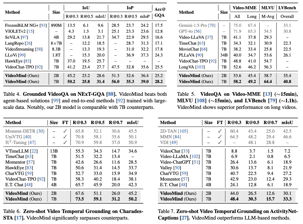 VideoMind의 효과를 평가하기 위해 Grounded VideoQA, VTG, VideoQA를 포함한 14개의 벤치마크에서 광범위한 실험을 수행했다. VideoMind는 시계열적 근거 기반의 증거와 정확한 답변을 동시에 제공, 복잡한 추론을 점진적으로 처리하는 능력을 입증했다. 특히 2B사이즈에서도 CG-Bench의 긴 비디오 과업에서 GPT-4o와 같은 최고 성능 모델을 능가하는 성능을 보인다. 또, VTG 및 일반 VideoQA 설정에서도 강력한 성능을 보인디ㅏ. Ablation Study 결과 설계선택의 핵심적 기여가 확인된다.