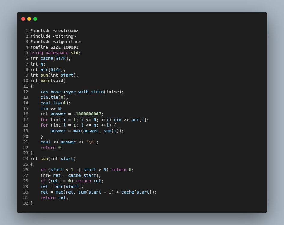 따라서DP[N] = max(arr[N], DP[N - 1] + arr[N])의 점화식 도출