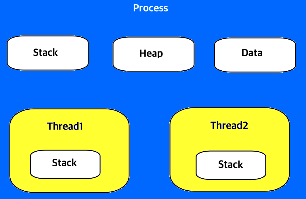 하나의 프로세스 내에는 여러 개의 스레드가 존재할 수 있으며, 이들은 프로세스가 가진 메모리 공간(힙 영역)을 공유하게 된다. 그러나 각 스레드는 독립적인 스택 공간을 가지고 있어, 자신만의 실행 흐름을 관리한다.