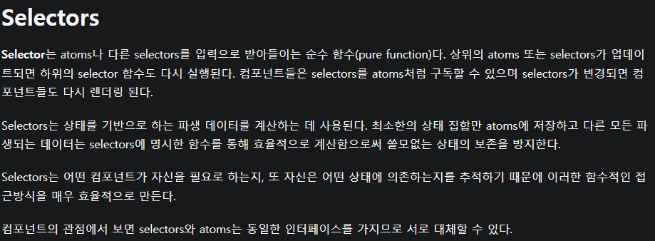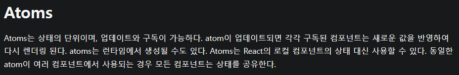 또한 이전에 Recoil 패키지를 처음 적용할 때 속성으로 그냥 가져다 썼었는데, 생각보다 프로젝트 안의 너무 많은 곳에서 Recoil을 남발하고 있는 모습을 보며 이렇게 쓸 것이 아니라 더 자세히 Recoil에 대해 알고 이해한 뒤에 써야 할 것 같다는 걱정도 있었다.