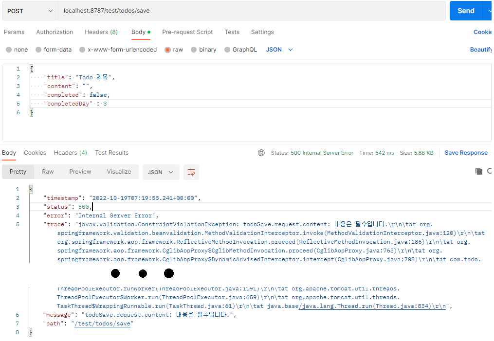 PostMan 으로 간단하게 @Valid 를 테스트하기 위해 content 값을 빈 값으로 요청하면 자동으로 일정 규격에 맞게 SpringBoot 에서 만든 에러를 응답합니다.
