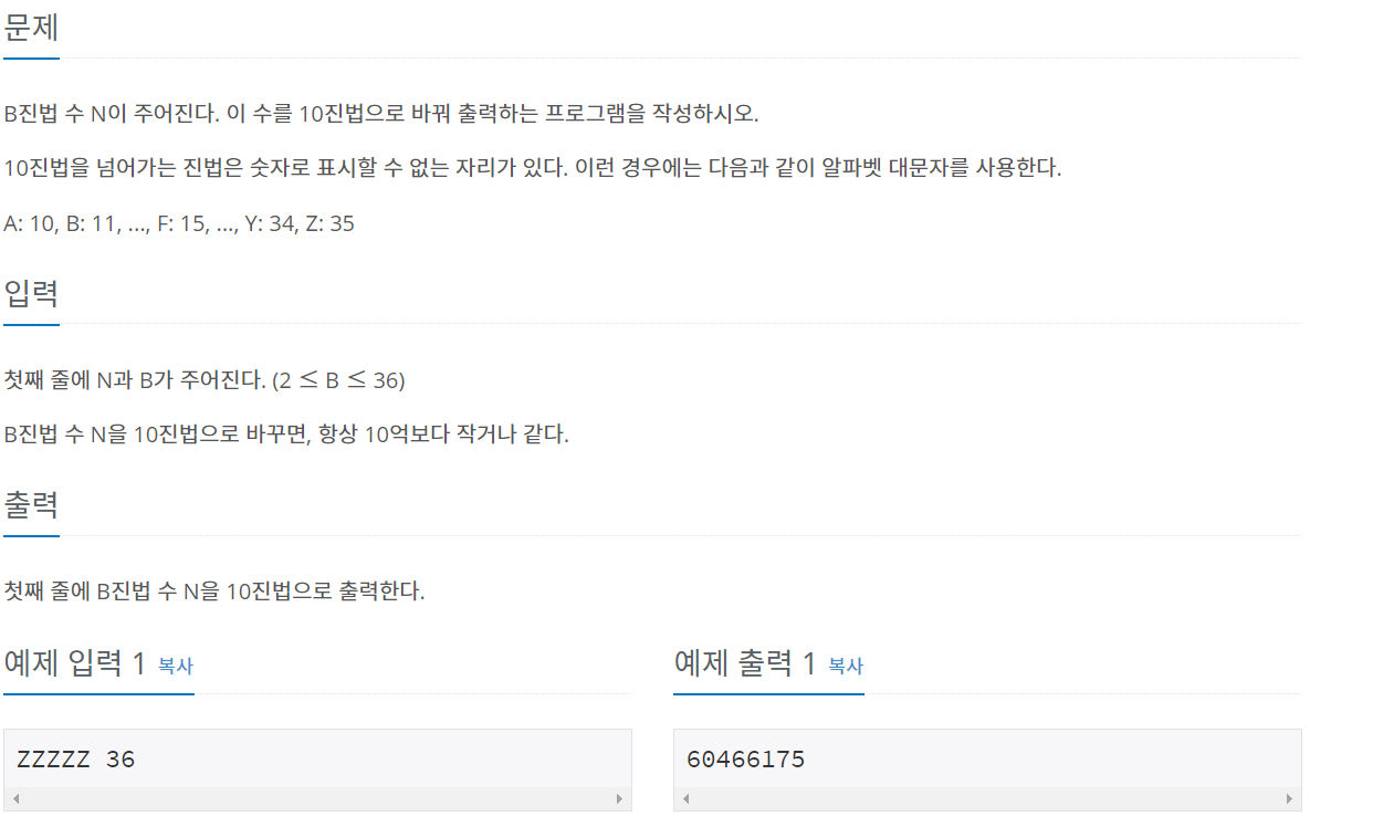 단순 구현문제 이다. dic이라는 딕셔너리를 하나 선언하고 A~Z까지 10~35를 집어넣는다. 그 후 입력받은 n을 리스트로 바꾸고 reverse로 뒤바꾼다. 그 후 문제에서 나온대로 입력받은 n원소가 dic에 있다면 dic에서 그 value를 꺼내와서 10진법으로 바꾼다. 그게 아니라면 1~9값이 n의 원소이므로 int로 명시적 형변환을 한 후 10진법으로 바꾼다. 그리고 result에 값을 더해주고 결과를 print한다.