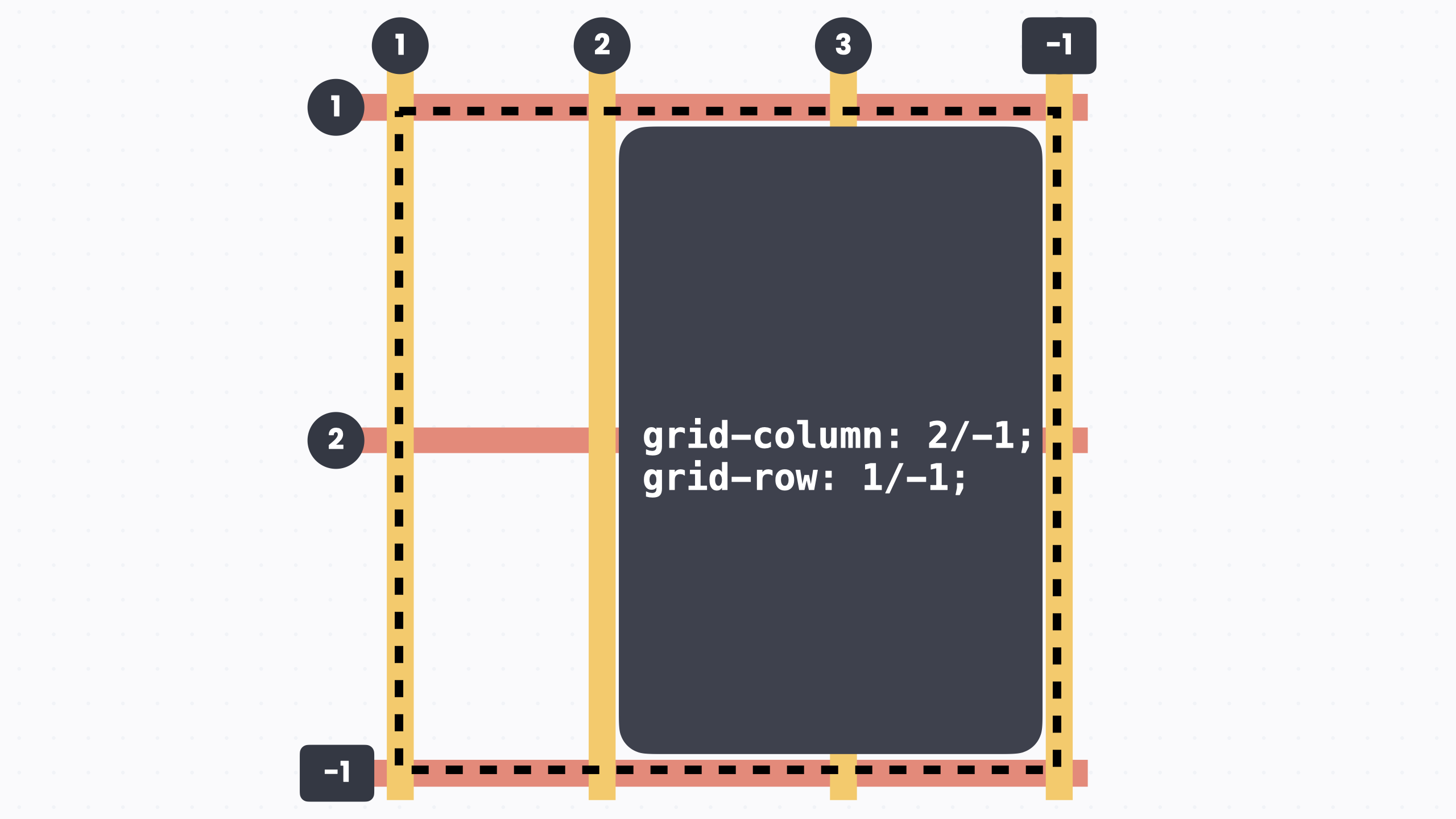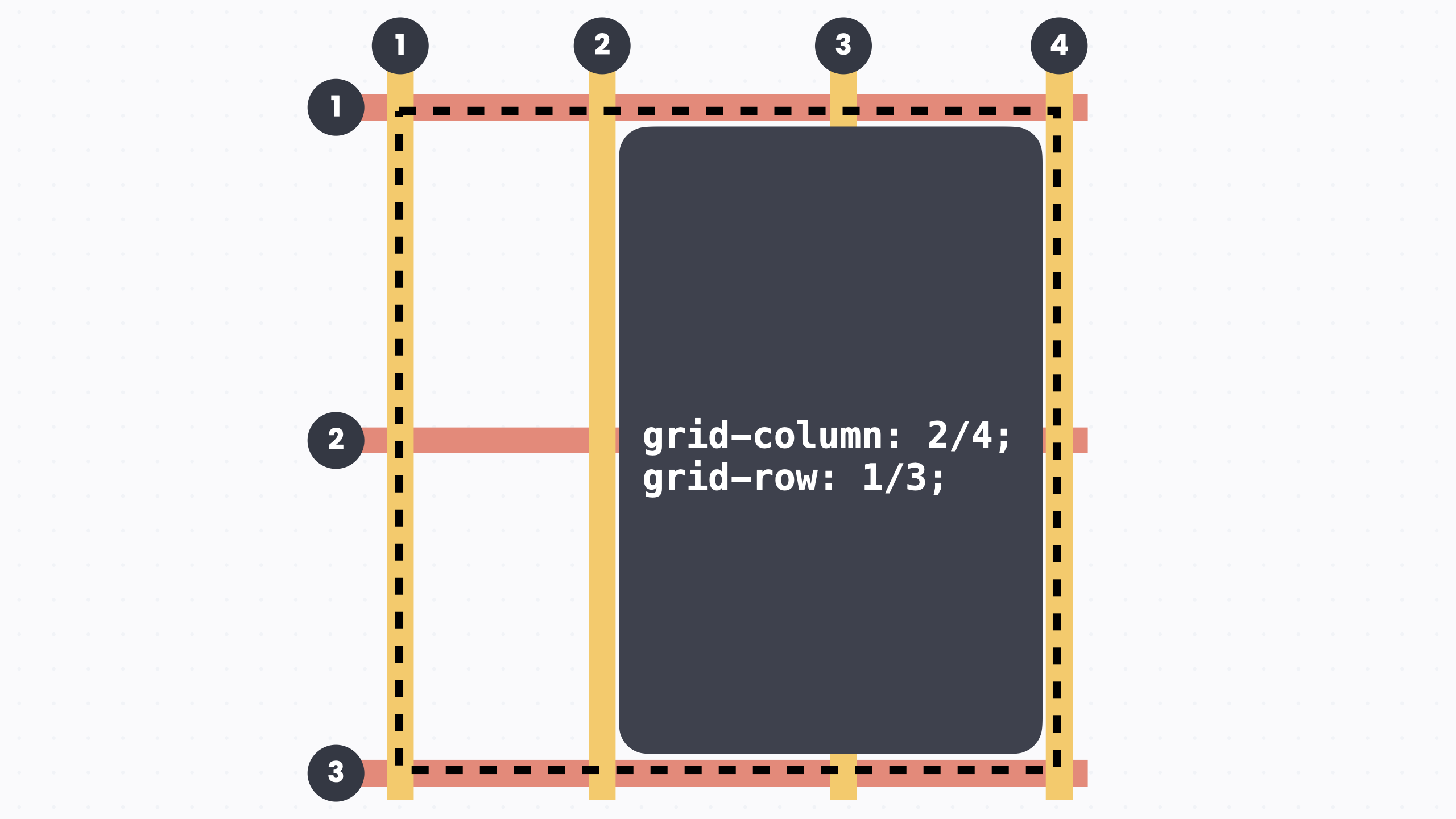 예를 들어서 2번 컬럼 라인에서 시작해서 4번 컬럼 라인에서 끝나고, 1번 로우 라인에서 시작해서 3번 로우 라인에서 끝나는 배치를 생각해 보겠습니다. 시작 라인과 끝 라인을 슬래시로 구분해서 적어주면 됩니다.