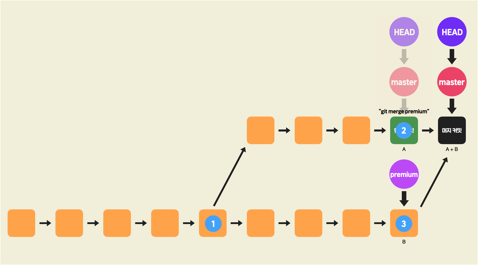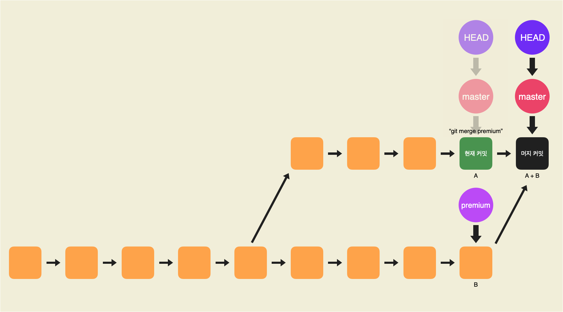 이 그림을 보면 지금 master 브랜치에서 premium 브랜치를 머지해서 검은색의 머지 커밋이 생긴 것을 알 수 있습니다.