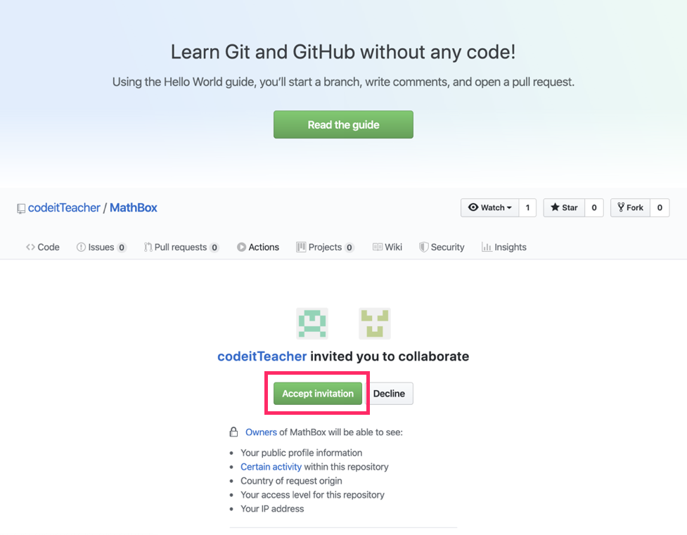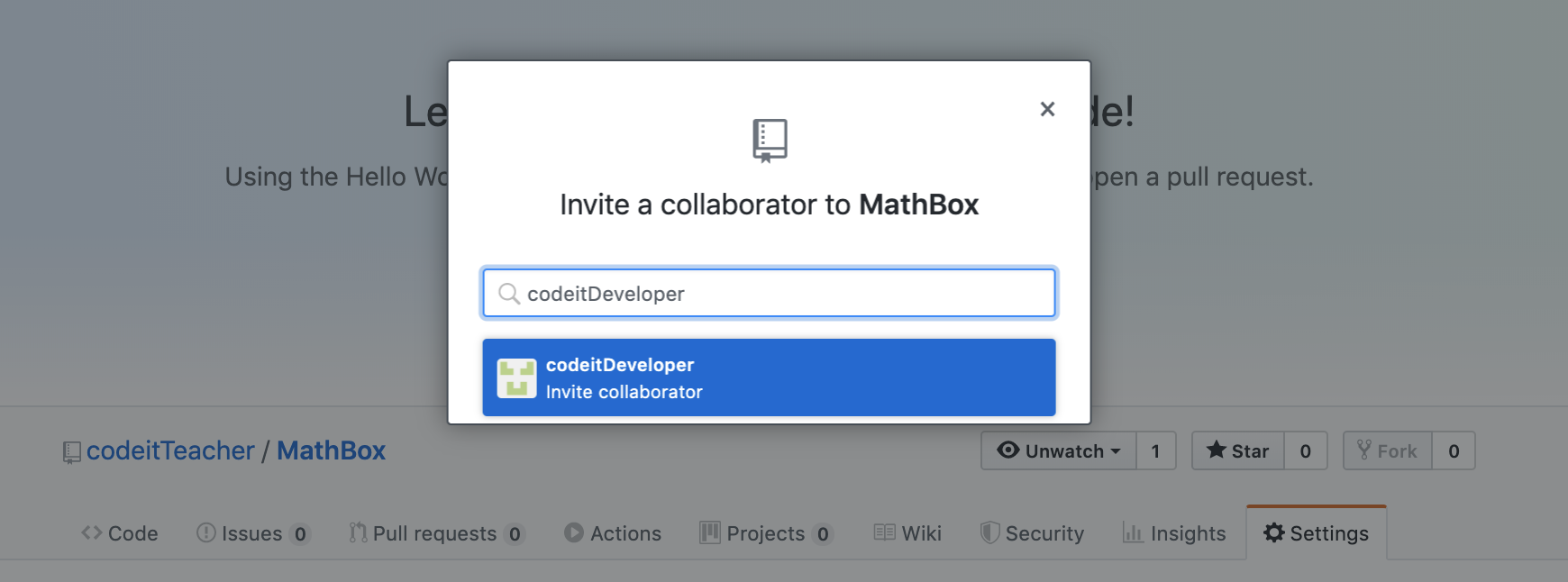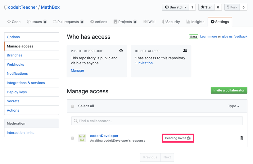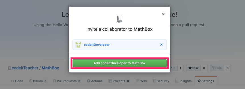 codeitDeveloper는 codeitTeacher가 소유한 MathBox 레포지토리의 collaborator가 됩니다.