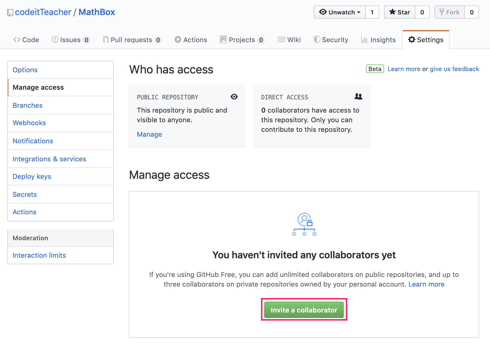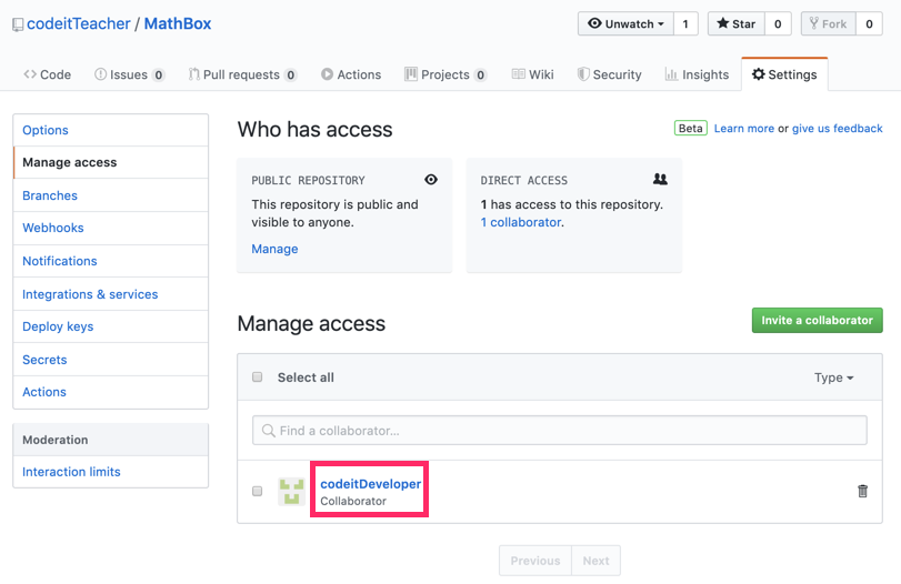 그리고 다시 원래 codeitTeacher 계정에서 확인해보면 codeitDeveloper가 정말 collaborator가 된 것을 확인할 수 있는데요. 이제 codeitDeveloper는 MathBox 레포지토리를 자신의 컴퓨터로 가져가서 수정한 후 git push를 해서 저의 리모트 레포지토리를 수정할 수 있습니다.