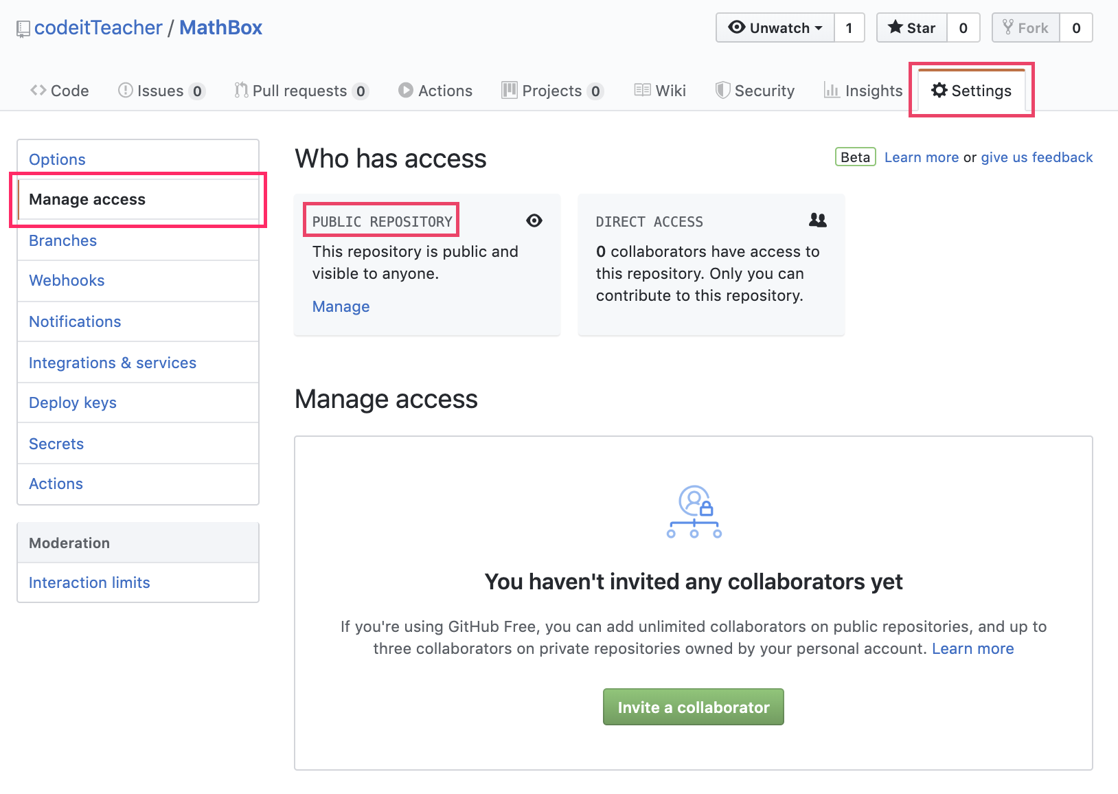 일단 GitHub 페이지에서 저(codeitTeacher)의 리모트 레포지토리인 MathBox의 설정을 살펴보겠습니다.