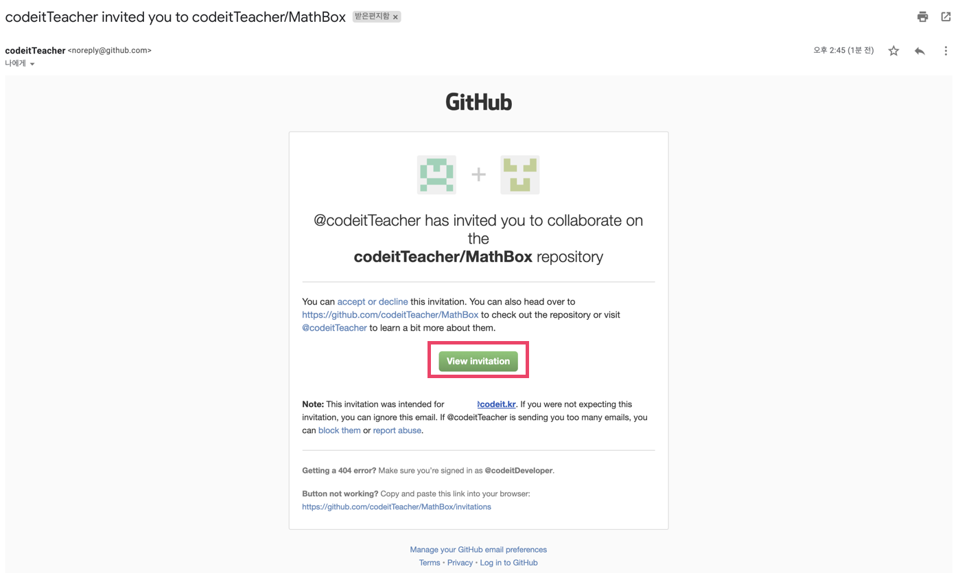 그럼 이제 codeitDeveloper는 아래와 같은 초대장을 받게 됩니다.