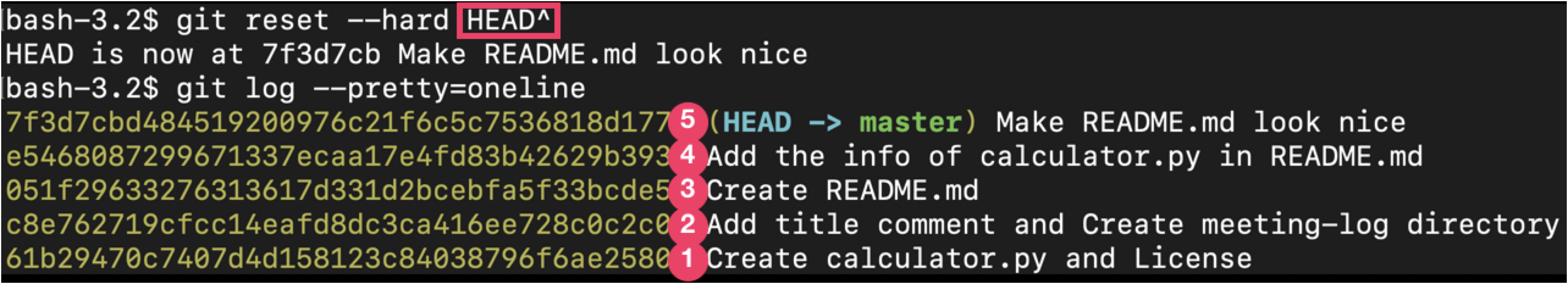 실제로 실행해보면 아래와 같이 HEAD가 이제 5번 커밋을 가리키는 것을 알 수 있습니다.