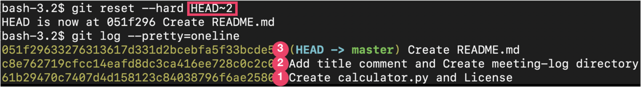 여기서 HEAD~2는 현재 HEAD가 가리키는 커밋보다 2단계 전에 있는 커밋을 나타냅니다. 지금 HEAD가 5번 커밋을 가리키고 있죠? 이 상태에서 위 커맨드를 실행해보면