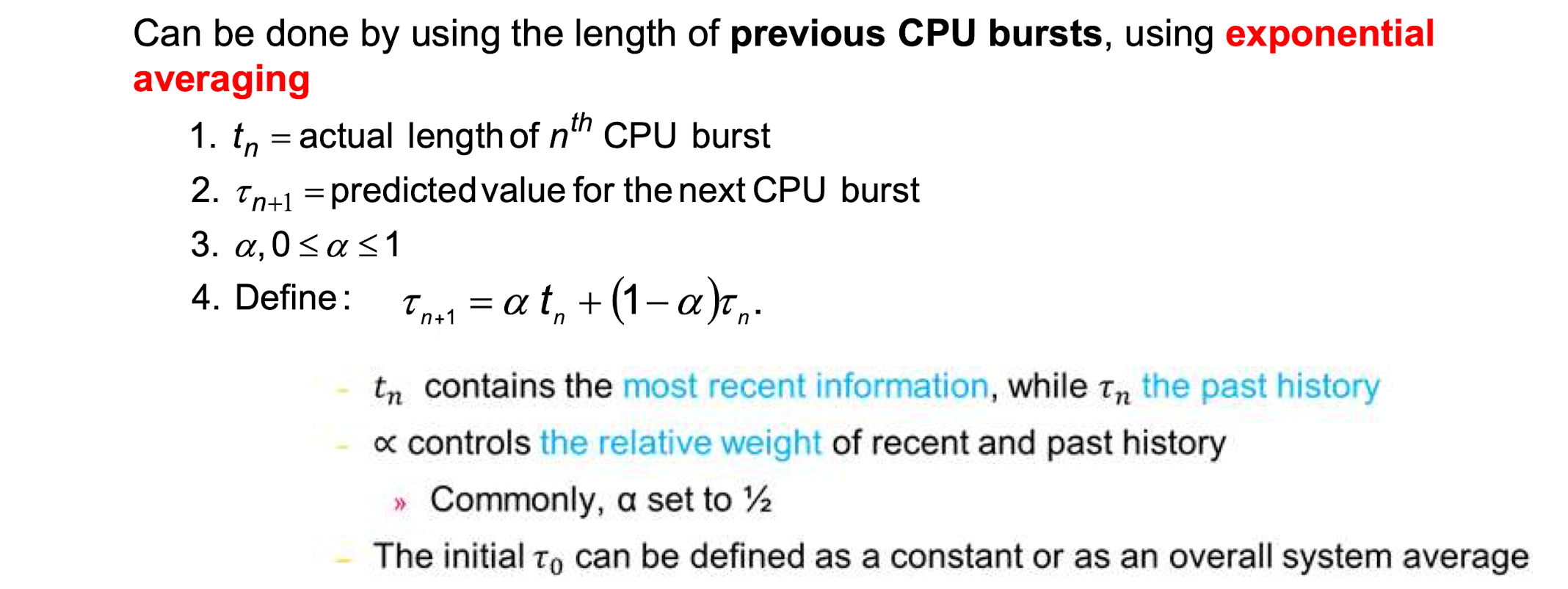 - 다음 CPU Burst의 길이가 이전 CPU Burst의 값과 비슷하다고 기대하고 근사값을 계산하여 구하는 것이다.