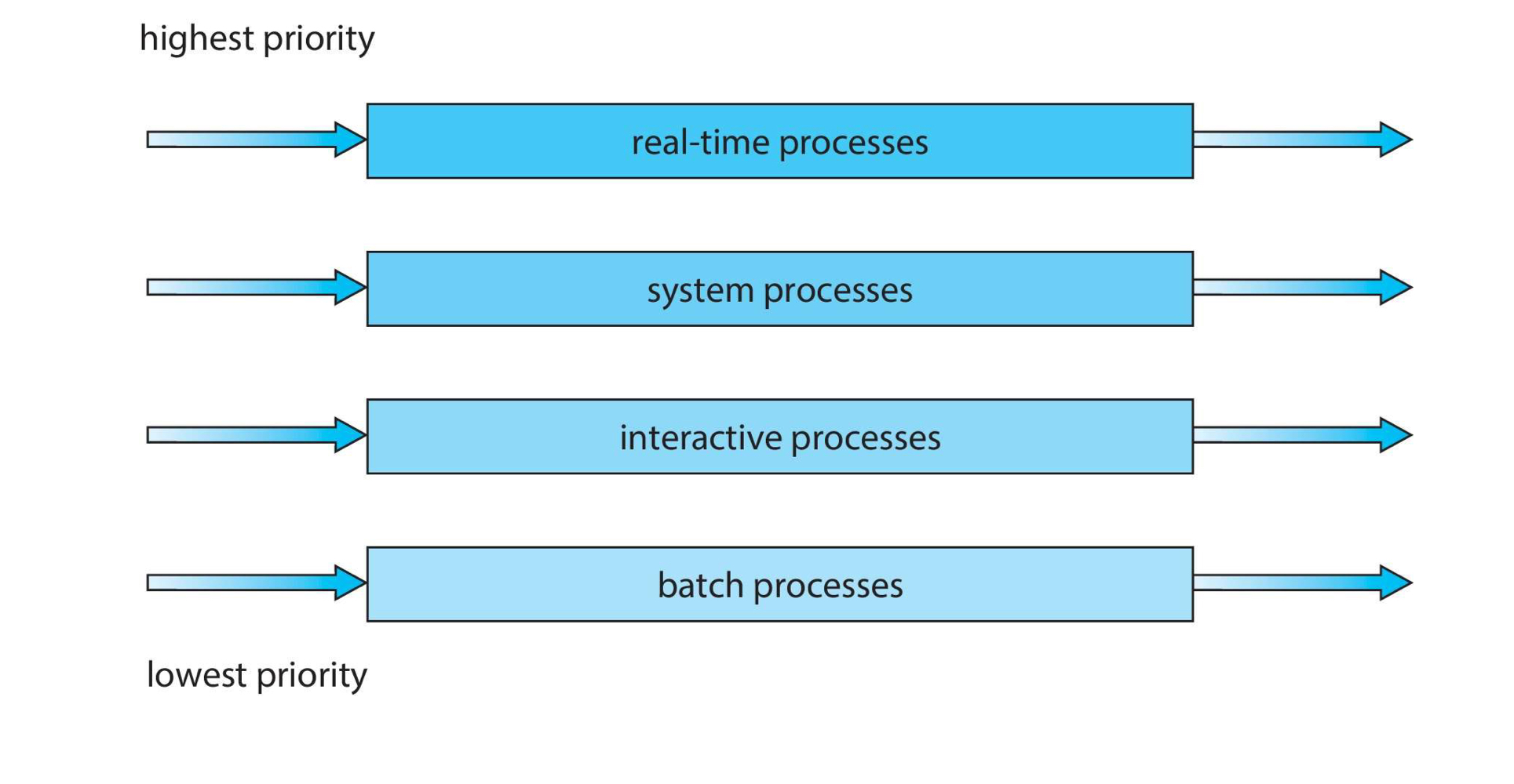 - 위에서 만들어진 서로다른 큐와 큐를 스케쥴링하는 큐또한 있어야한다. 일반적으로 고정 우선순위의 선점형 스케쥴링으로 구현되어 각 큐는 낮은 우선순위의 큐보다 절대적인 우선순위를 가진다.
