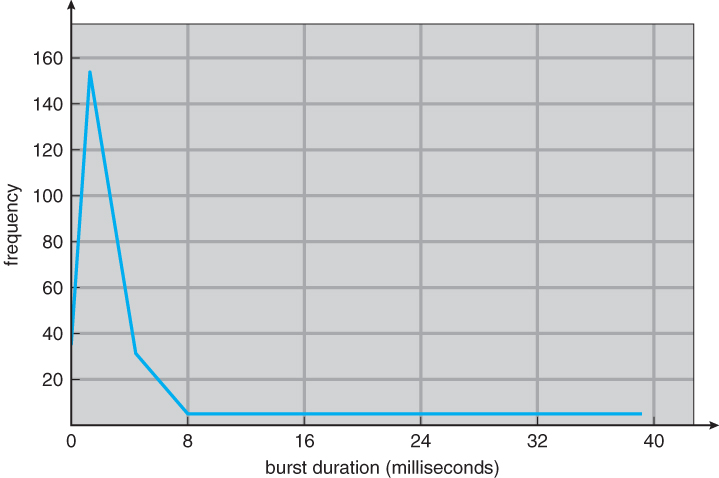 - 위 그래프는 CPU-Burst의 지속시간과 빈도 수를 나타낸 그래프이다. 짧게 지속되는 Cpu-burst의 빈도가 오래 지속되는 Cpu-Burst 빈도보다 많다.