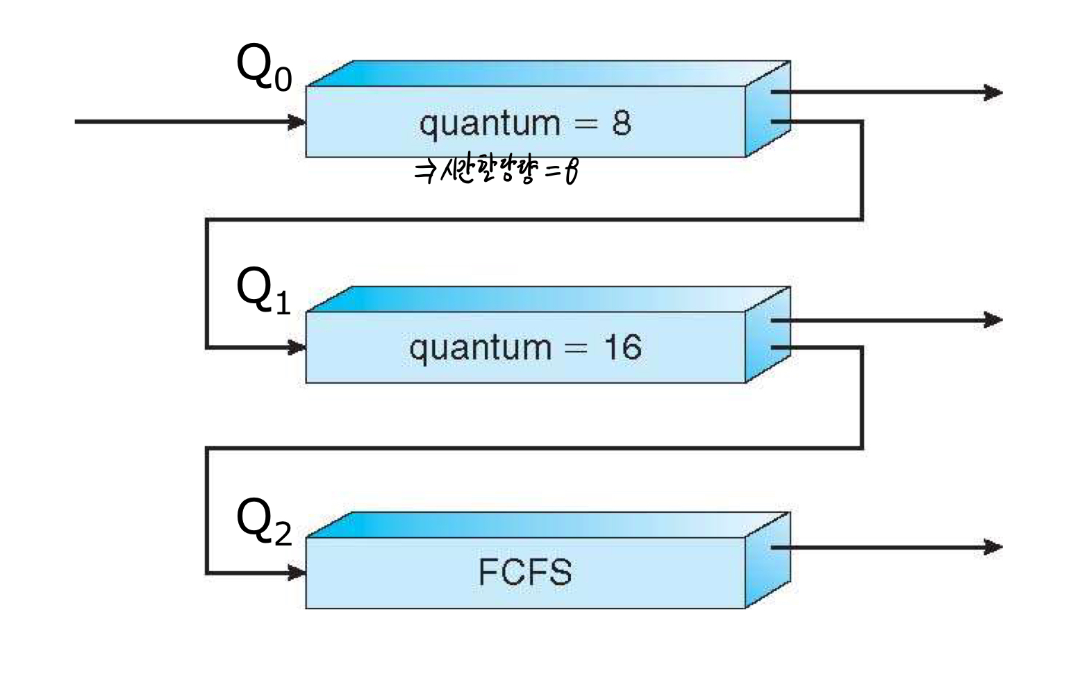 - 먼저 CPU burst시간에 따라 프로세스를 구분하고 그 프로세스를 Cpu burst 시간을 기준으로 한 준비완료 큐에 넣는다. CPU burst 시간이 짧은 큐에 있는 프로세스가 실행되고 만약 주어진 시간 할당량 안에 프로세스가 끝나지 않는다면, 그 프로세스는 현재 있던 스케쥴링 큐보다 우선순위가 한단계 낮은 스케쥴링 큐의 꼬리로 이동된다.