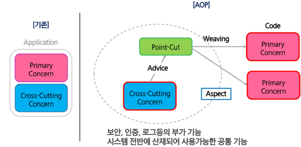 - 기존 OOP(객체지향 프로그래밍)에서는 수행시간 측정과 같은 공통 관심사항을 여러곳에 적용하려면 중복된 코드가 생겨나는 한계가 있다. -> 이를 해결하기 위해 AOP 등장