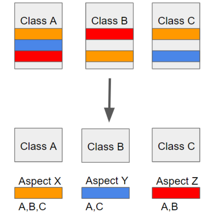 여러 오브젝트에 나타나는 공통적인 부가 기능을 모듈화하여 재사용하는 기법