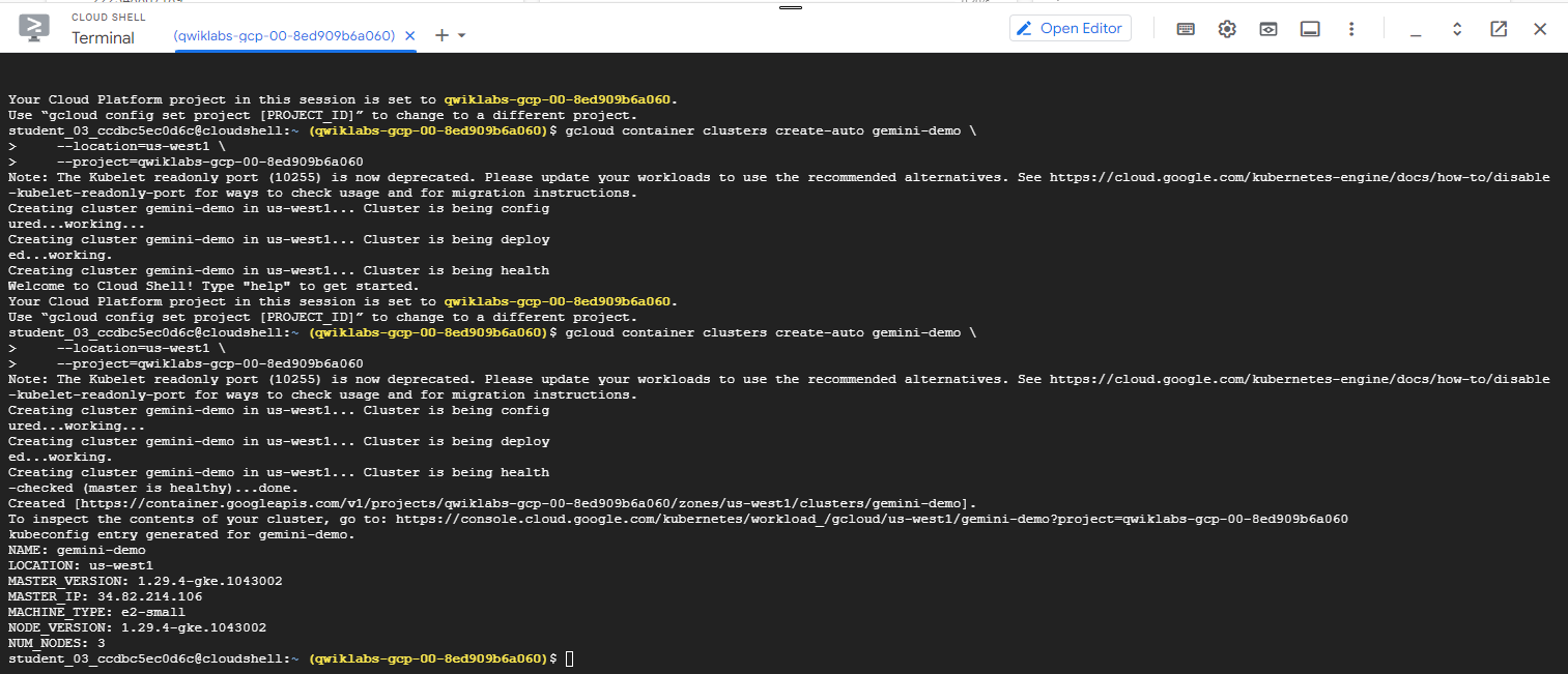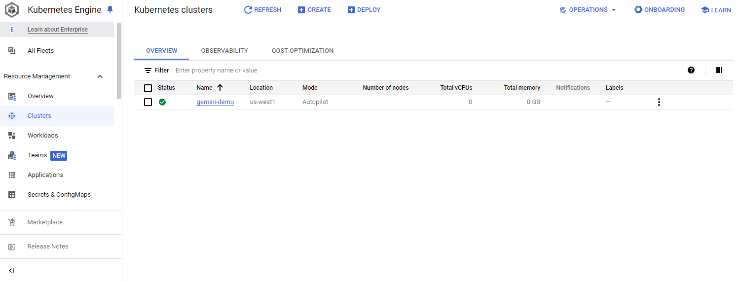 Kubernetes Engine -> Clusters에서 gemini-demo가 생성된 걸 확인할 수 있다.