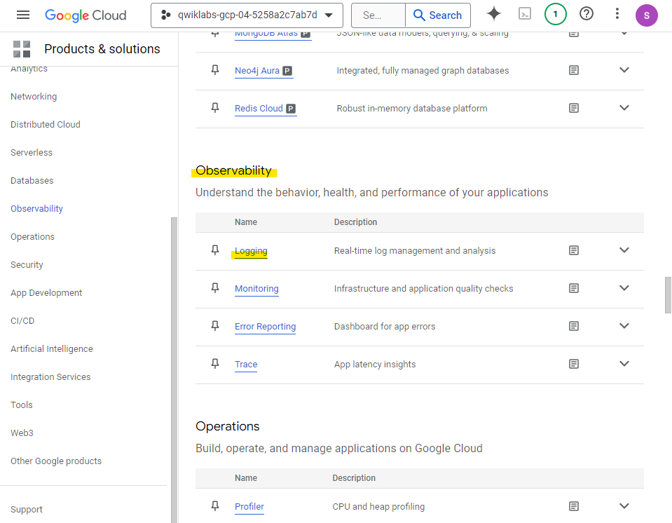 메뉴 -> VIEW ALL PRODUCTS -> Observability -> Logging