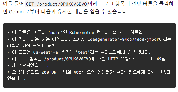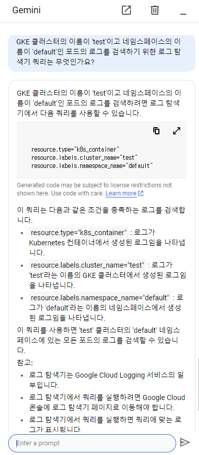 Gemimi 프롬프트를 이용해 GKE 클러스터 이름과 네임스페이스 이름으로 로그를 탐색하는 쿼리를 생성해서 넣어준다.