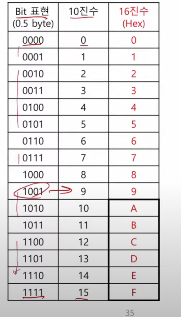 0.5 byte = 4 bit = 2^4 = 16개의 숫자 표현 가능 (0~15)