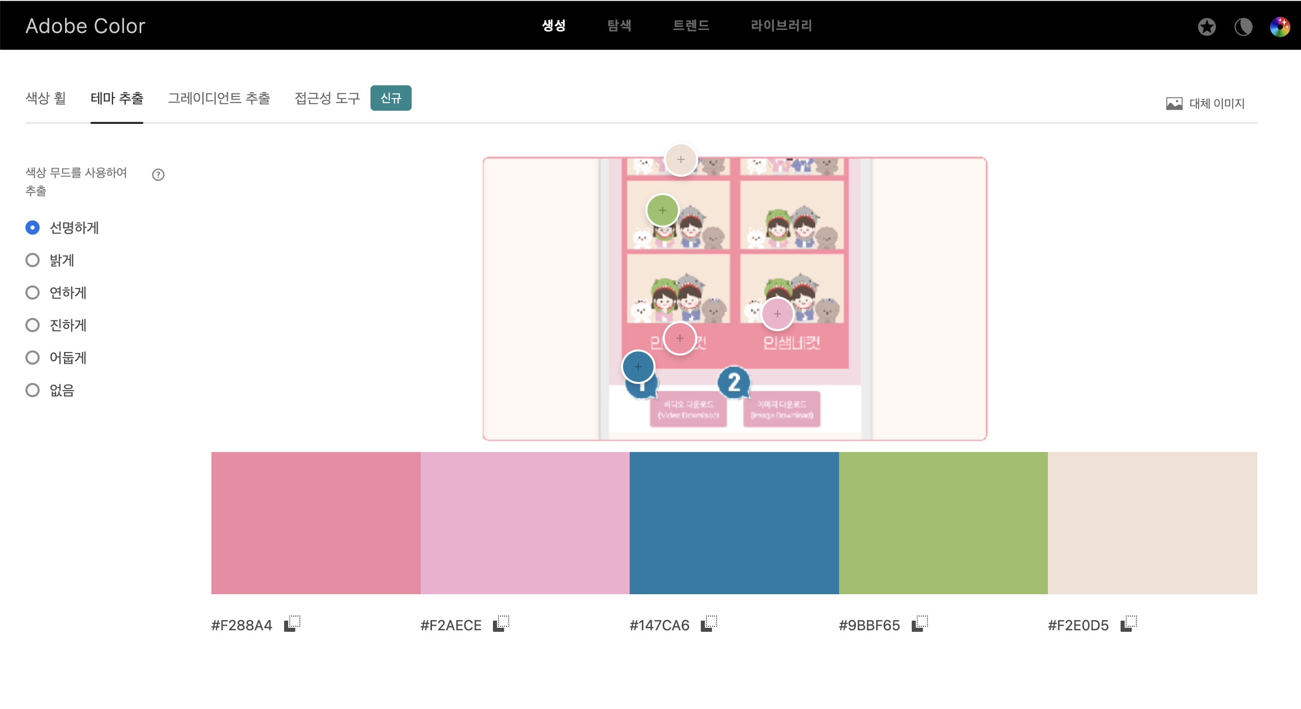 그래서 Adobe Color를 참고한 이미지의 테마색을 가져와 사용했습니다.