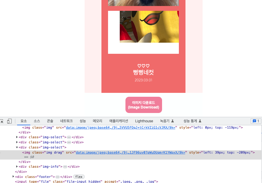 버튼 클릭시 요소를 캡쳐해서 파일로 만들어 a 태그의 다운로드로 이미지를 다운받을 수 있습니다.