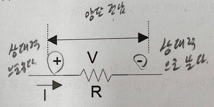 전류의 방향: +방향, 전압이 높은 곳에서 낮은 곳으로 흐름