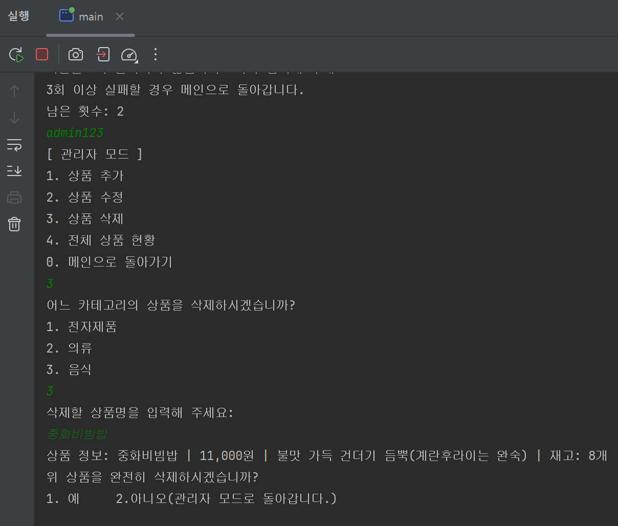 System.out.println("위 상품을 완전히 삭제하시겠습니까?\n1. 예 2.아니오(관리자 모드로 돌아갑니다.)");