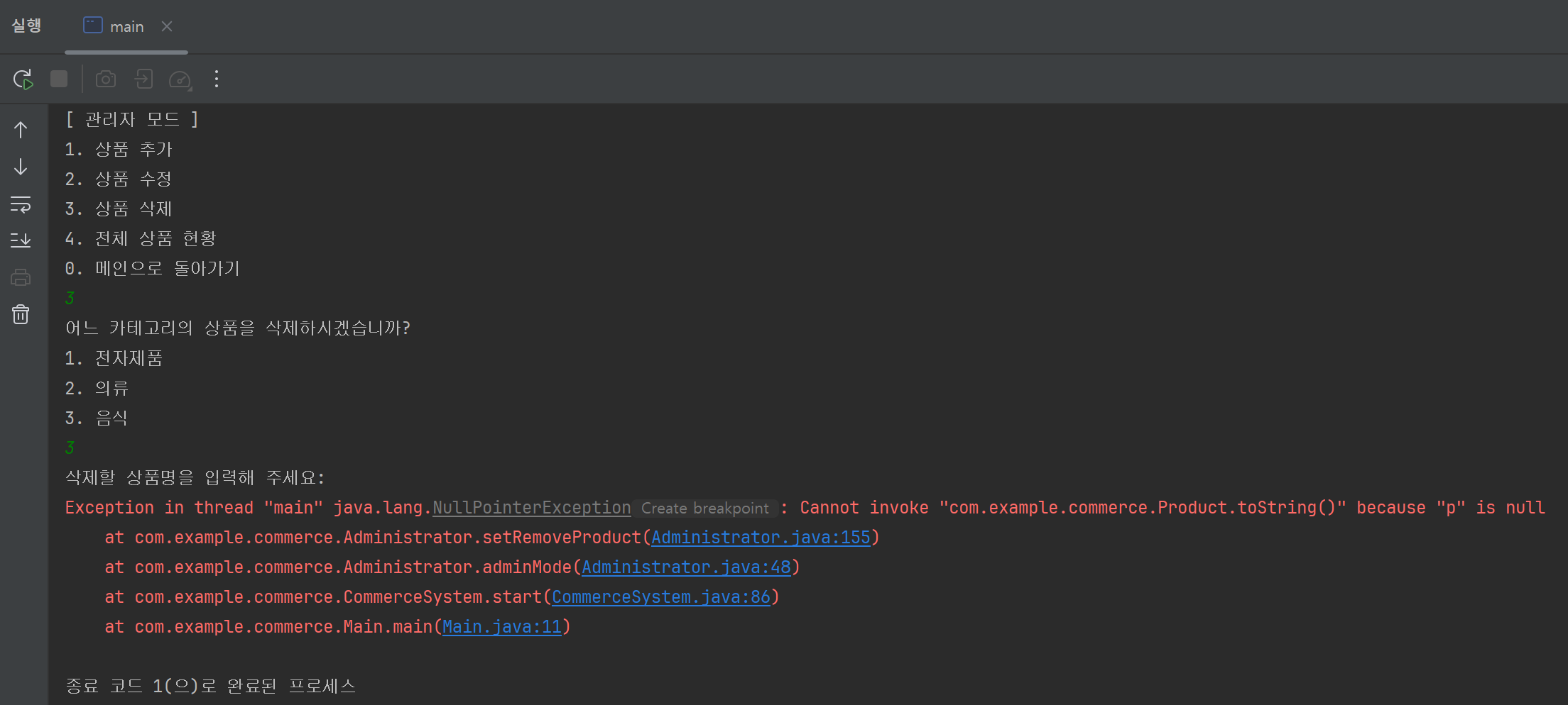 (원인) 장바구니를 조회해주는 메서드를 호출하는 곳은 CommerceSystem 클래스다. 그리고 장바구니에 들어있는 Product를 삭제하고 있는 곳은 Administrator 클래스다. 이 두 곳의 Cart 객체는 각각 선언된 별개의 객체다. 아무것도 담기지 않은 장바구니에서 삭제할 수 있는 게 있을리 없다...