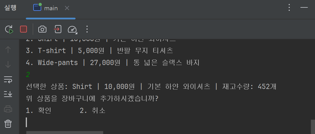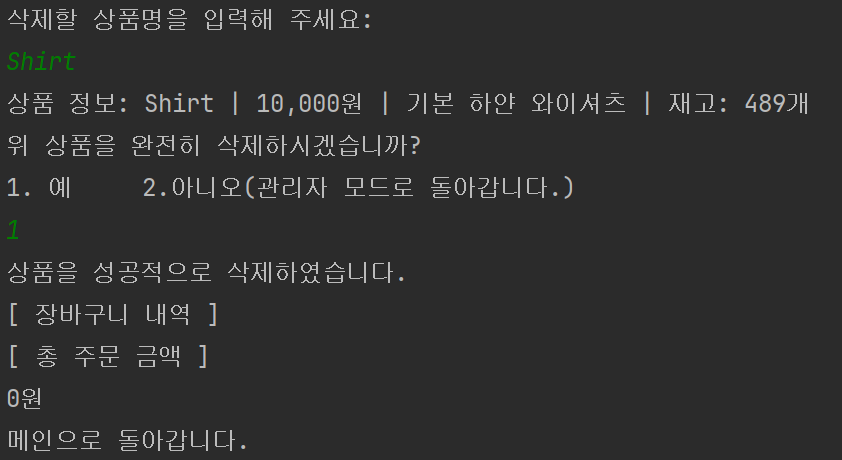 장바구니에서 Product를 삭제한 뒤 Cart의 목록을 출력해본 결과다.