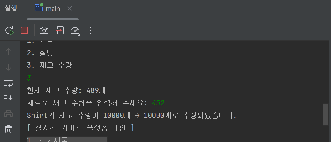다른 요소들은 다 잘 바꿨는데 재고 수량만 안 바뀌었다. 테스트 입력값은 임의로 넣은 건데 우연히 잘 걸렸다. 각 동작에 맞는 변수를 사용하도록 제대로 고쳐줬다.