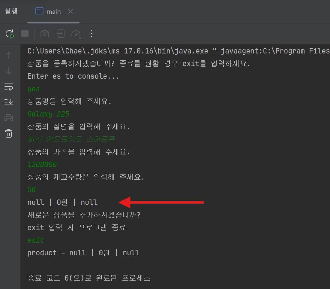 null이 안 나오도록 getter 메서드도 수정해서 겨우 정상적으로 출력되는걸 확인했는데...