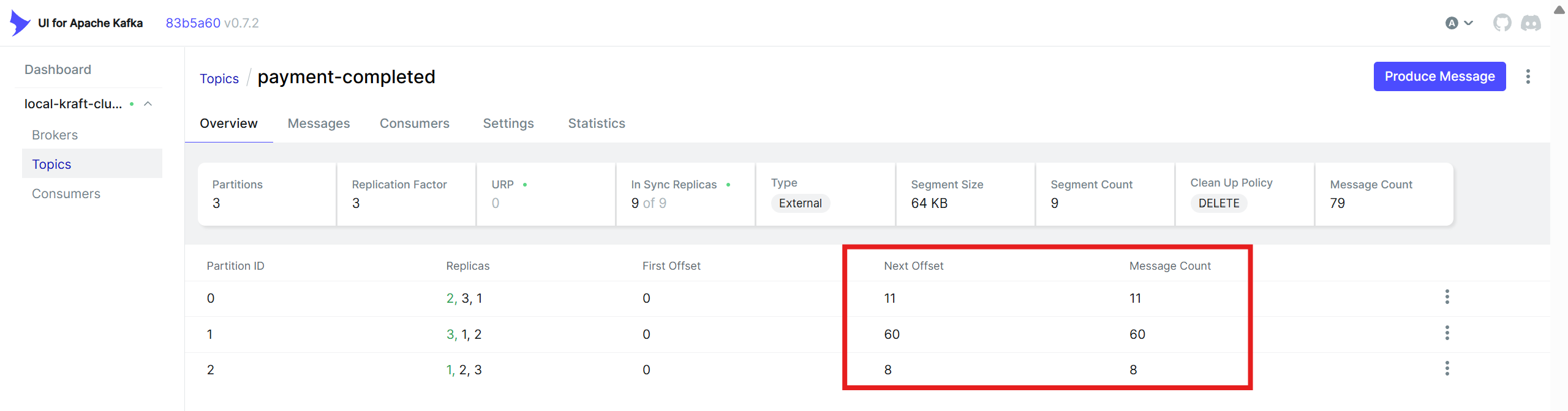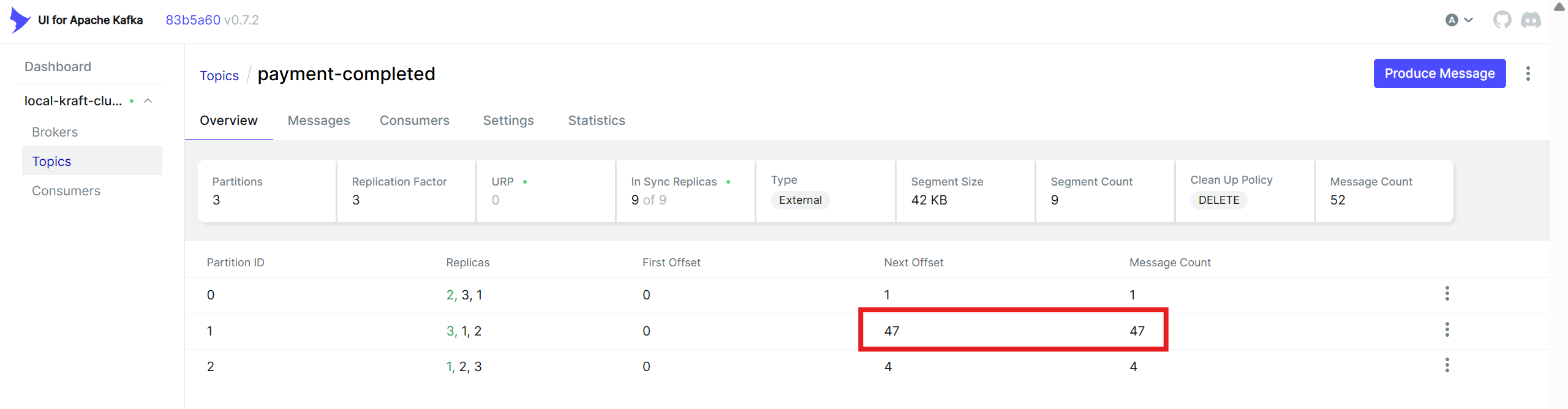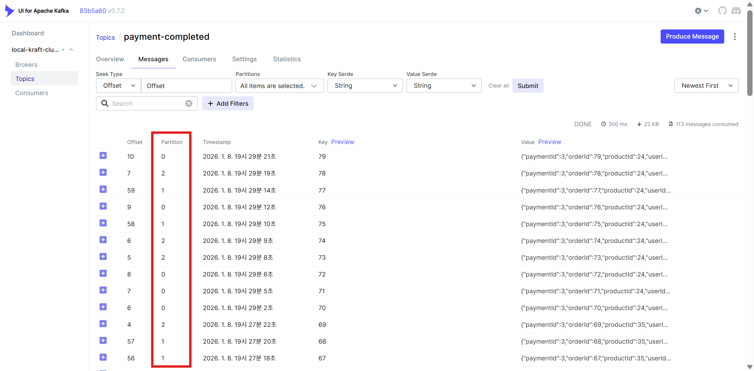기존 구조에서 메시지가 각 파티션에 고루 전달되는 형태로 수정했다.