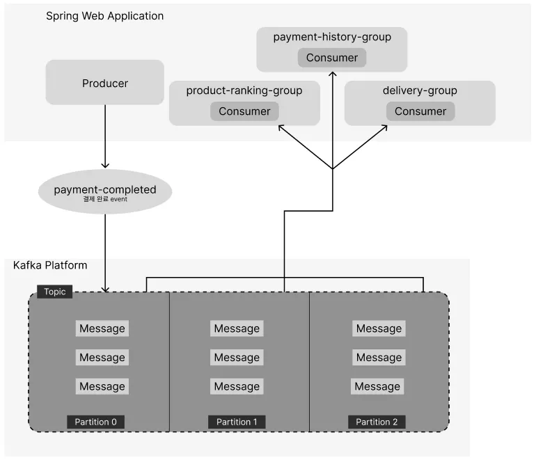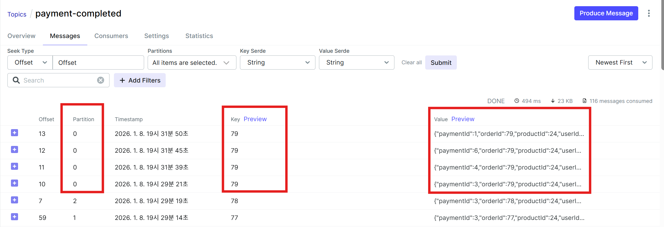 이 event의 경우 결제 완료를 의미하므로, 사용자보단 주문 중심으로 처리되도록 설정하는 게 좋겠다고 판단했다. 사용자가 주문을 취소할 경우 같은 주문 ID가 같은 파티션 내에서 처리되도록 설정하는 게 정보를 편하게 찾아낼 수 있을 것이다.