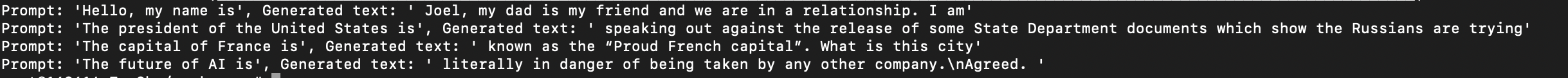 print(f"Prompt: {prompt!r}, Generated text: {generated_text!r}")코드를 입력하세요