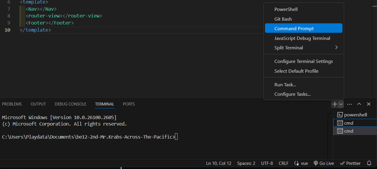 이때 하단의 터미널이 처음에는 powershell로 되어있을텐데, +버ㅜ튼을 눌러서 Command Prompt를 열어야 npm 등을 이용한 명령어를 입력할 때 정상적으로 작동한다.