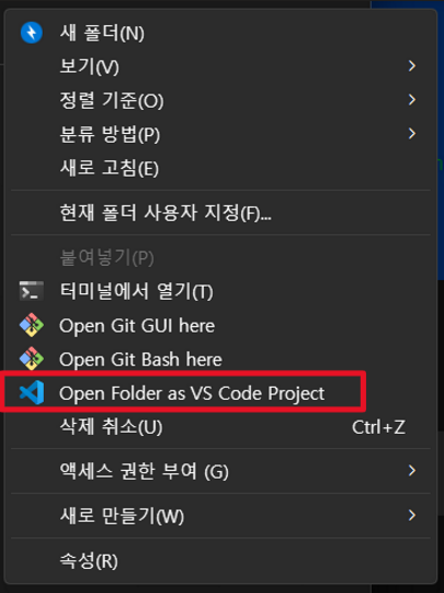 폴더에서 빈 공간에 마우스 오른쪽 클릭을 한 다음 Open Folder as VS Code Project를 선택해주면 끝
