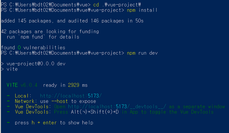 를 하면 http://localhost:5173을 통해 초기 화면으로 접근할 수 있다.