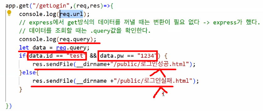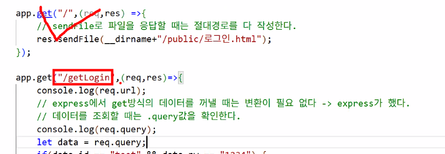 action="http://localhost:3000/" → "3000번 포트에 누가 왔어요!" (app.listen(3000);) → 사용자가 어디로 들어왔나요? → 포트 번호 뒤에 아무것도 없는 메인으로 왔어요: app.get("/",(req,res)=>{res.sendFile("/로그인.html")}); 친구가 계속 메인 페이지를 다시 돌려줌 (값에 대한 처리가 없음) → "3000번 포트에 누가 왔어요!" → 메인 이동 → … → 계속 빙글빙글 돌고만 있음값을 "어디로" 보내느냐가 중요!