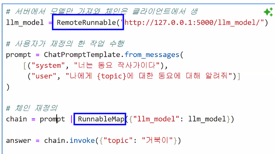 RemoteRunnable("http://127.0.0.1:5000/llm_model/") → 로컬 서버에 있는 llm 모델 가져오기RunnableMap({"llm_model": llm_model}) → 서버에서 가져온 모델을 연결해 사용하겠다는 의미llm_model = RemoteRunnable("http://127.0.0.1:5000/llm_model/")