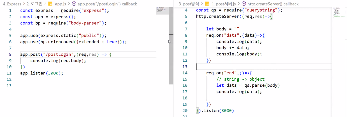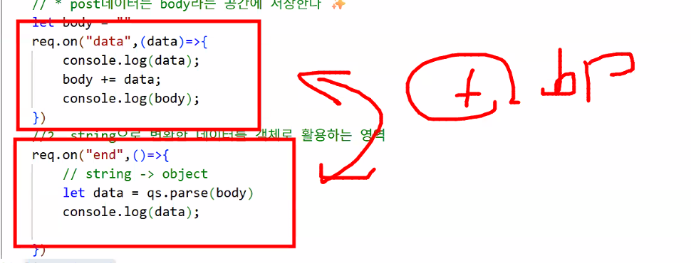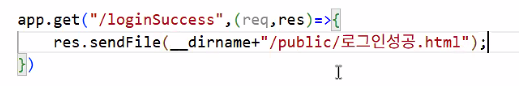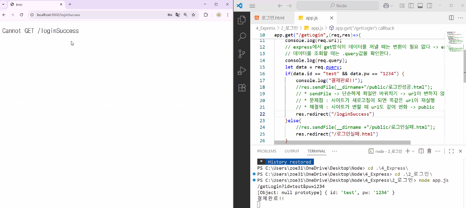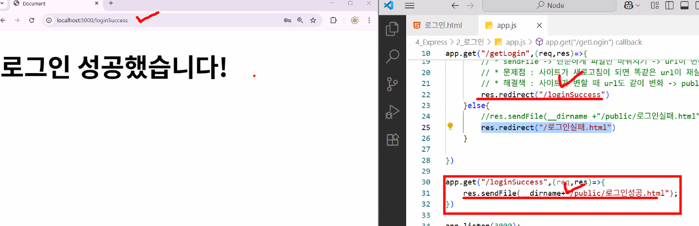 app.get("/",(req,res)=>{res.sendFile(__dirname+"/public/login.html")});가 처리할게요~ → 사용자에게 절대 경로 상에 있는 파일 보여주기action="http://localhost:3000/getLogin"으로 데이터 보낼게요 → app.js: app.get("/getLogin",(req,res)=>{});로 받을게요😊action="http://localhost:3000/"으로 보내버리면 무한 루프에 빠짐 (req에 정보가 담겨 있긴 하지만 이걸 쓰면 메인 경로 안에서 전부 처리해야 해서 역할 분담이 안 됨)req.query라는 객체로 바로 쓸 수 있음TIP: 파일 자체를 redirect로 리턴해버리면 url에 파일명이 나오니까 파일명을 바로 명시하지 말고 다른 경로로 보내기!